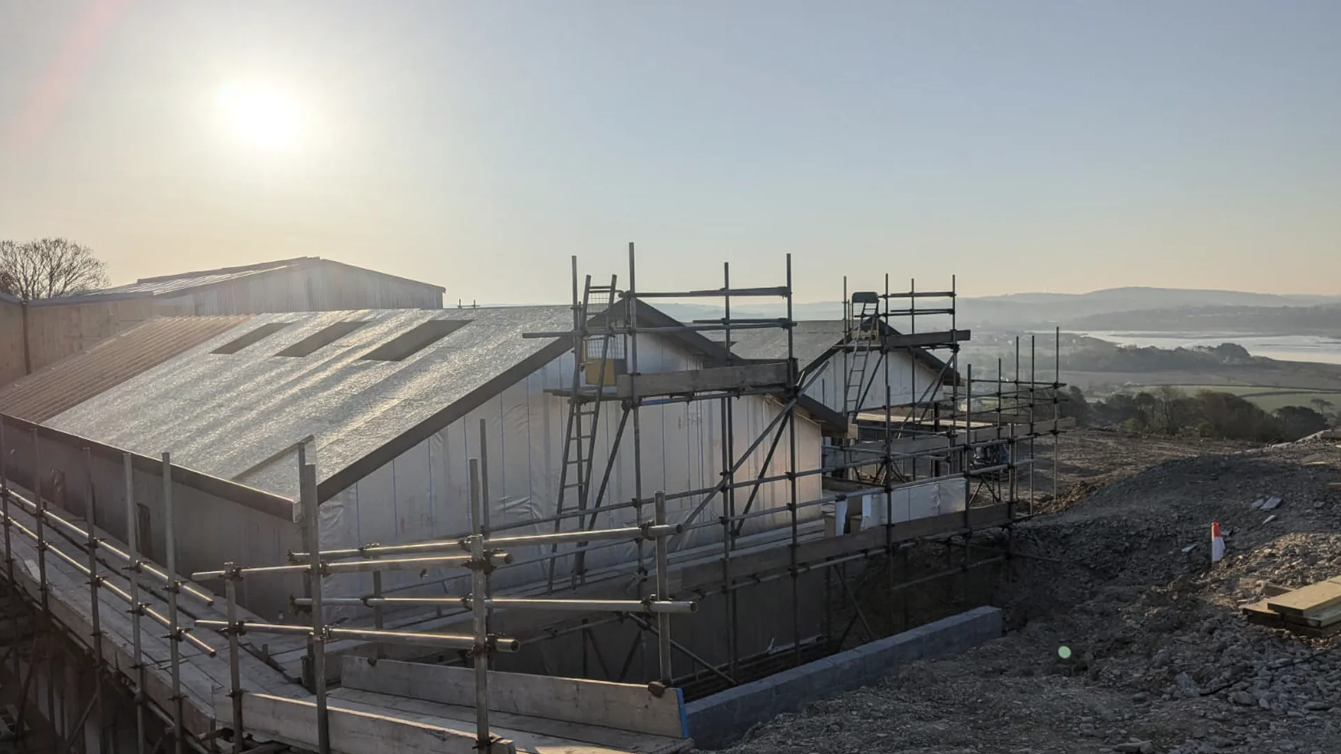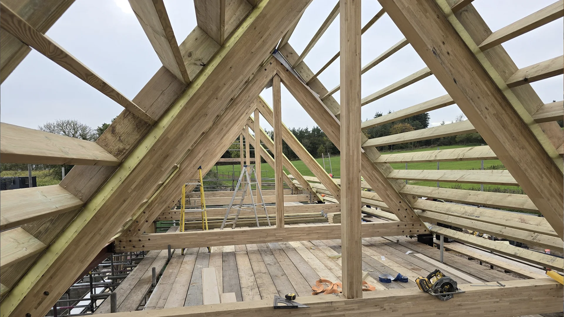 One of the huge benefits of timber frame construction i sthat we pre-fabricate as much of the building off-site. Insuring a swift installation of every project